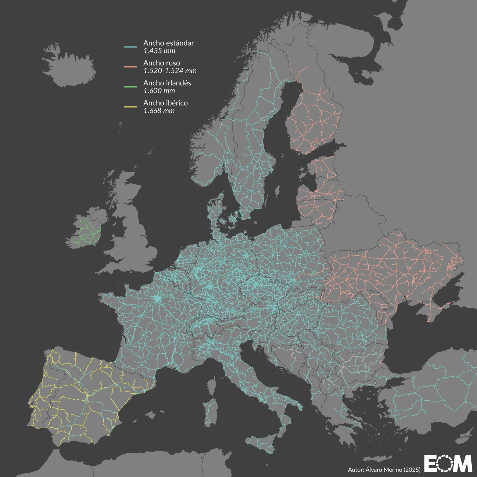 La complicada orografía de la península ibérica y la necesidad de usar locomotoras más potentes obligó a implantar vías de tren más anchas que el estándar internacional —1.668 milímetros frente a 1.435— en el siglo XIX. La alta velocidad española sí se construyó ya en ancho internacional, pero no ha sucedido así con el nuevo trazado extremeño ni con la alta velocidad portuguesa. Eso imposibilita su integración con el AVE y el resto del Corredor Atlántico. Además, Bruselas exige que los nuevos proyectos usen el estándar internacional, por lo que en algún momento Madrid y Lisboa habrán de reconvertir el ancho de vía de su conexión.
